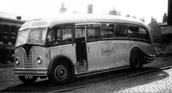 Although generally speaking the Harrington motto might be that you could have any kind of body you wanted, the post war half cab coach settled down to a very consistent appearance. Some customers requested full fronted coach work, either new or more often as a replacement for a half cab. This in effect meant a mirror of the cab side and since there were no other changes to the body, from certain angles it is quite difficult to tell if a coach is full front or half cab. Hawkey's AEC Regal MAF 699, pictured above, was body number 810 and is a typical example; from the front wheels back it has no significant difference from a half cab body on this chassis. Usually the radiators were concealed and the full front bodies often had a large amount of flamboyant bright trim to make up for it!