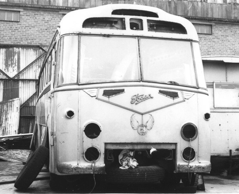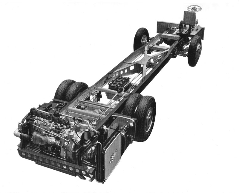 Foden PVR The Foden rear engine chassis was introduced in 1950 and was a variation of an existing front engine design. The rear engine layout meant that the chassis was suitable for the types of bodywork now being fitted to under-floor chassis designs from large manufacturers such as AEC and Leyland. Despite the fact that this particular configuration is now widely accepted in the bus and coach business, the Foden failed to find the sales its advanced specification deserved. Only 54 chassis were delivered to the UK market. In true Foden tradition it was heavily over engineered and this was reflected in the price. Also in a traditionally conservative market still coming to terms with the passing of the half-cab style, many features of the chassis may have represented too much of a change at that time. The provision of sidelockers was looked upon as a poor substitute for a large boot, which of course now had an engine in it. The brakes are a complicated Lockheed "hydraulic over hydraulic" system. This features an oil pump driven by the engine which provides a constant circulation of high-pressure fluid. When the brakes are applied the oil is admitted to a chamber in the cylinder for the conventional hydraulic circuit and provides power assistance to the foot pedal. Although the hydraulic system is by Lockheed, Foden designed the mechanical aspects of the brakes themselves.